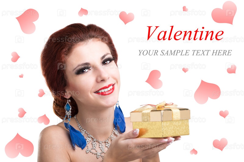 Рыжеволосая счастливая девушка и подарок на белом фоне