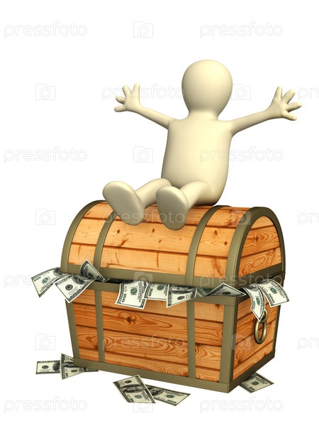 Человечек, сидящий на сундуке, набитом деньгами