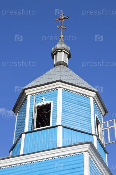 Колокольня православной церкви с открытыми окнами на фоне голубого неба