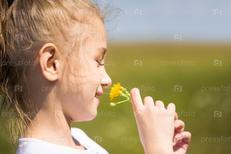 Светловолосая девушка наслаждается приятным запахом желтого цветка на свежем воздухе