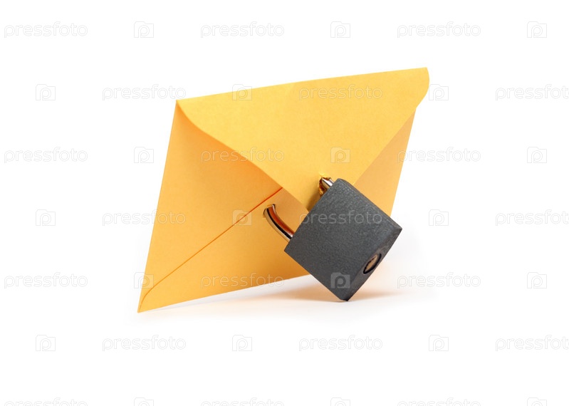 Желтый конверт с висячим замком на белом фоне
