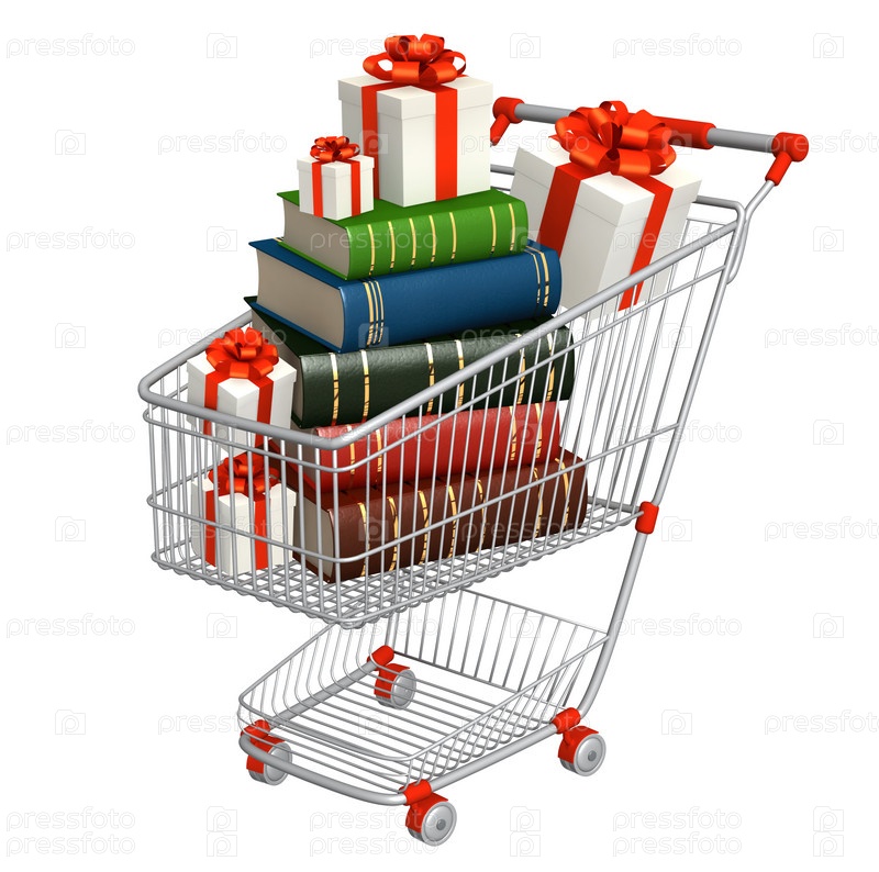 Подарки и книги в магазинной тележке