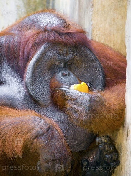 Большой орангутанг ест желтый фрукт