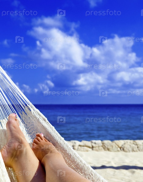 Женские ноги в гамаке на фоне океана и неба