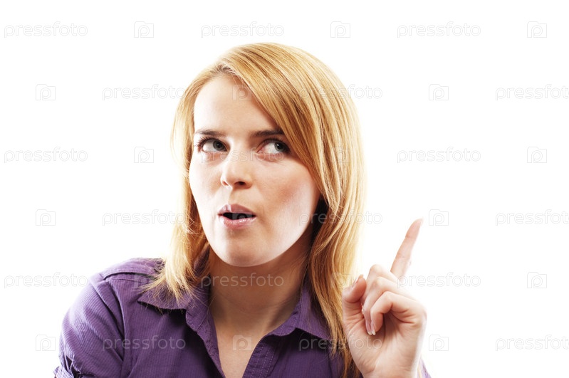 Рыжеволосая девушка с поднятым пальцем на белом фоне