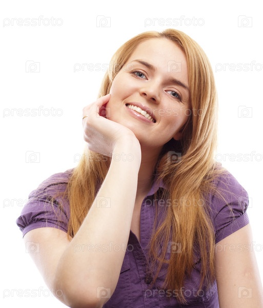 Улыбающаяся рыжеволосая девушка на белом фоне