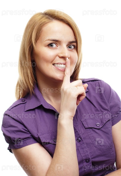 Рыжеволосая девушка на белом фоне прижимает палец к губам