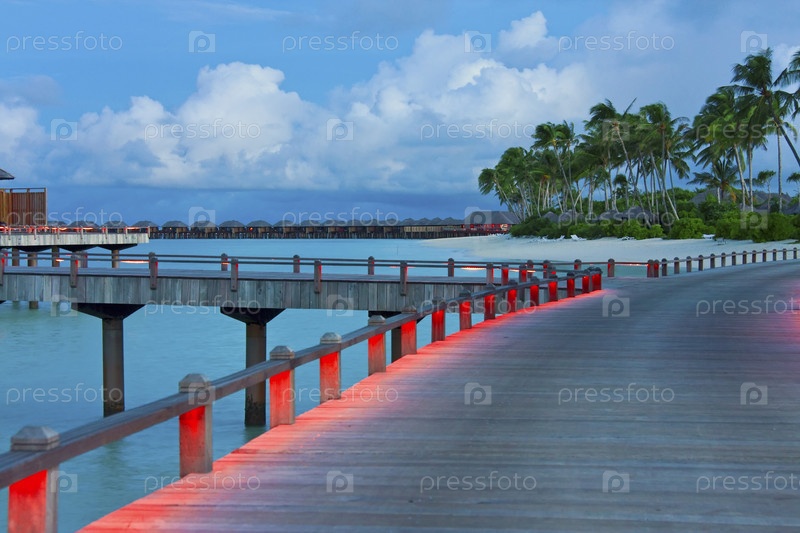 Освещенный мост ночью на Мальдивах
