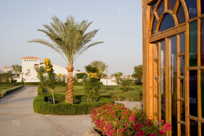 Территория отеля, украшенная экзотическими подстриженными деревьями