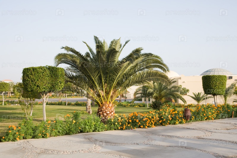 Территория отеля, украшенная экзотическими подстриженными деревьями