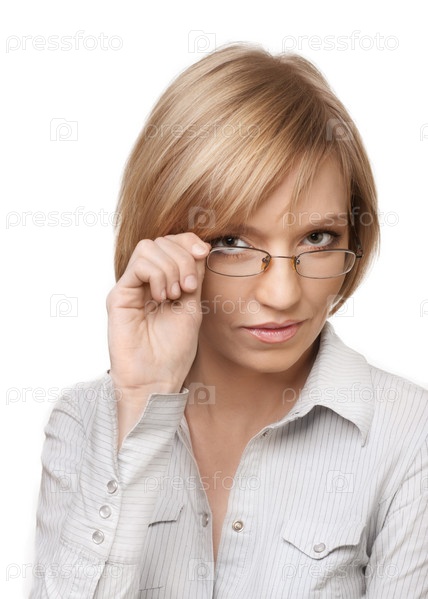 Привлекательная женщина-предприниматель в очках смотрит на камеру на белом фоне