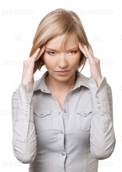 Привлекательная женщина-предприниматель испытывает головную боль, изолирована на белом фоне