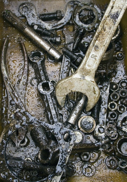 Гаечный ключ и другие слесарные инструменты в масле