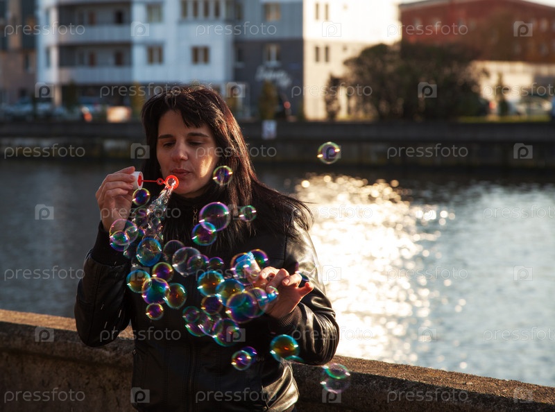 Молодая красивая женщина дует мыльные пузыри