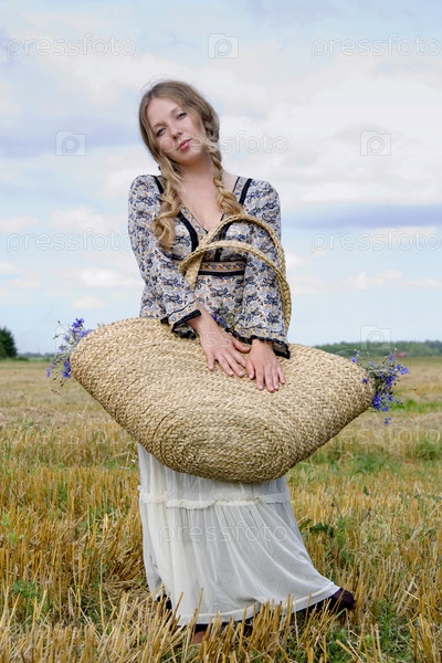 Женщина в белой юбке с корзиной цветов на плече