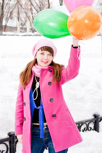 Красивая молодая женщина в розовом пальто с воздушными шарами зимой в парке
