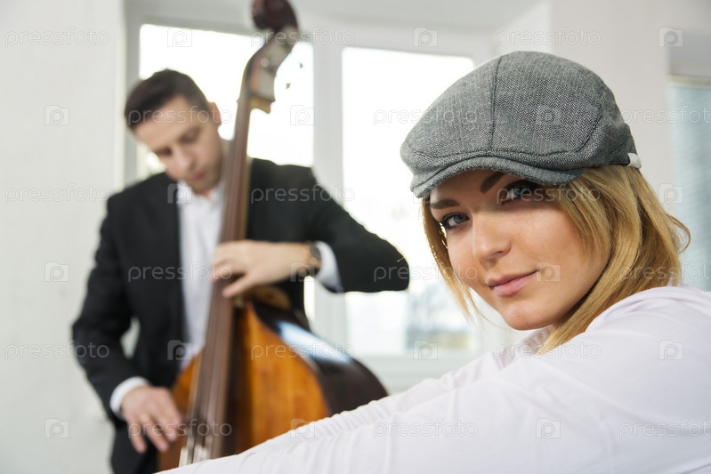 Женщина на стуле и контрабасист на заднем плане