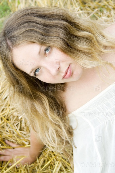 Женщина с длинными волосами и голубыми глазами на сене, лето