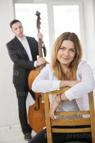Женщина на стуле и контрабасист на заднем плане