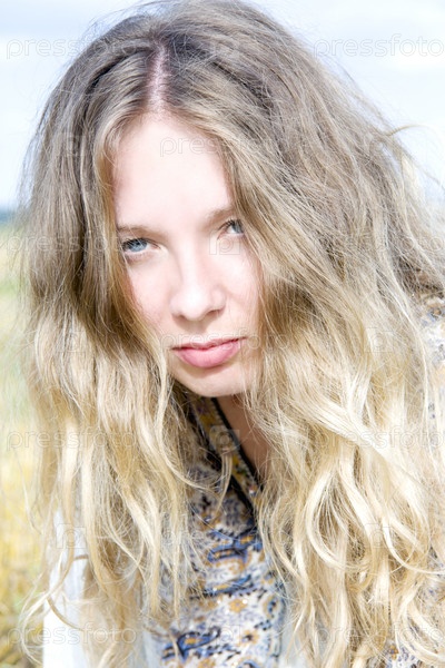Женщина с длинными волосами и голубыми глазами на фоне неба