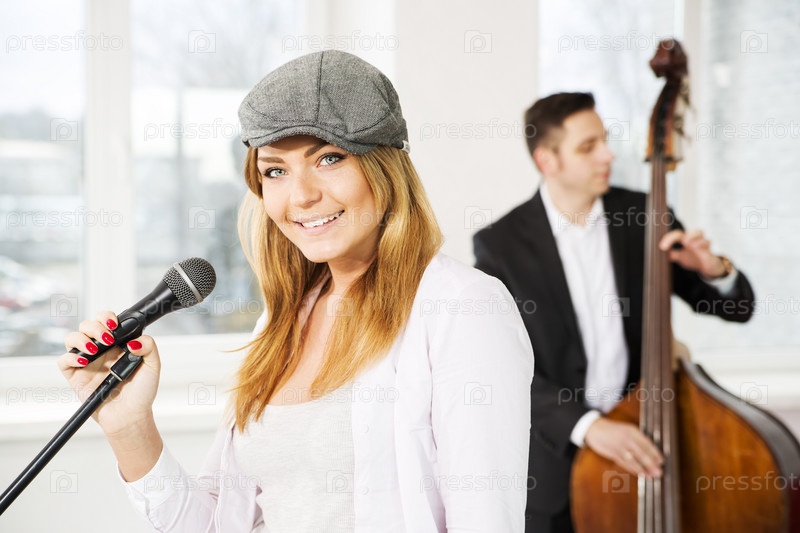 Женщина рядом с микрофоном и виолончелист
