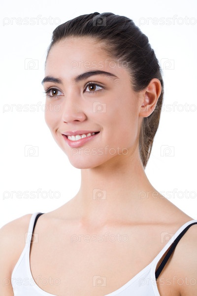 Свежая девушка смотрит в сторону с счастливой улыбкой на белом фоне