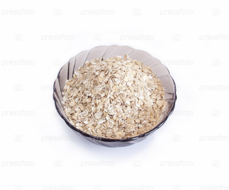 Овсяные хлопья в стеклянной тарелке на белом фоне