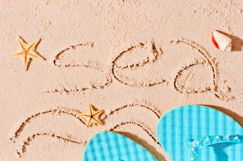 Надпись МОРЕ и пляжные принадлежности на влажном песке