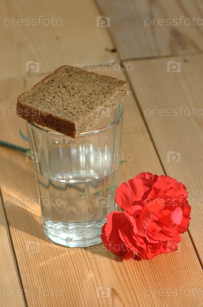 Стопка водки и красная гвоздика на деревянном столе