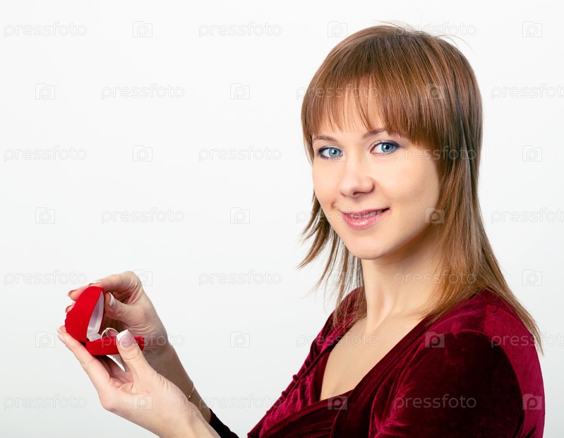Молодая женщина открывает коробочку с кольцом