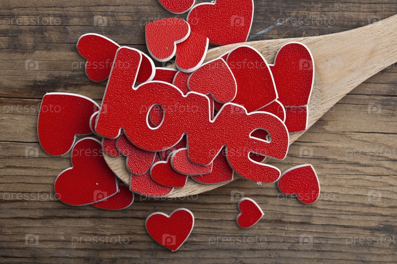 Красные сердечки и слово Любовь на столе