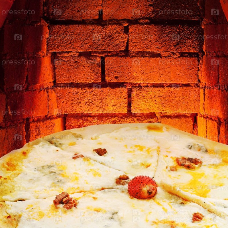 Пицца Кватро формаджи и открытый огонь в печи