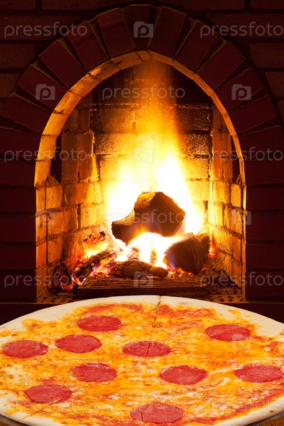 Пицца с салями и открытый огонь в печи