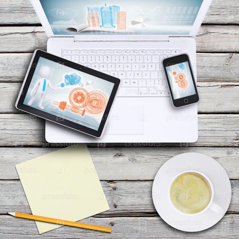 Ноутбук, планшетный компьютер, смартфон и чашка кофе