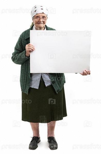 Улыбающаяся пожилая женщина с плакатом