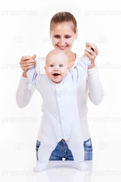 Счастливая женщина с сыном на белом фоне