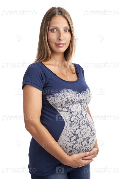 Молодая беременная женщина на белом фоне