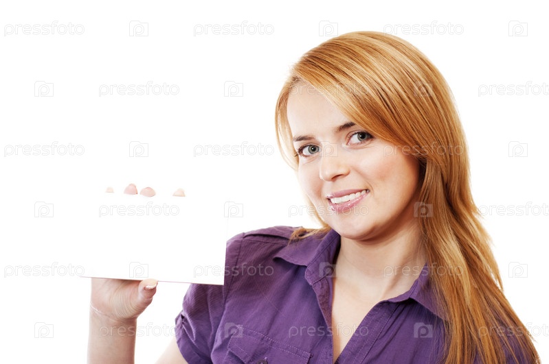 Веселая девушка с белой табличкой