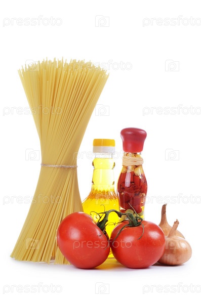 Макароны с оливковым маслом и помидорами, изолированные
