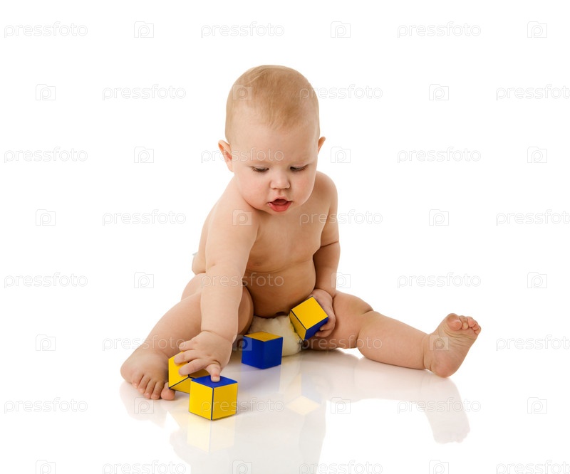 Любопытный малыш играет кубиками на белом фоне