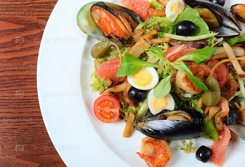 Салат с кальмарами, филе тунца, мясом мидий