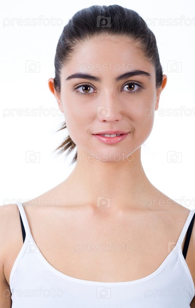 Свежая девушка смотрит в камеру с улыбкой на белом фоне
