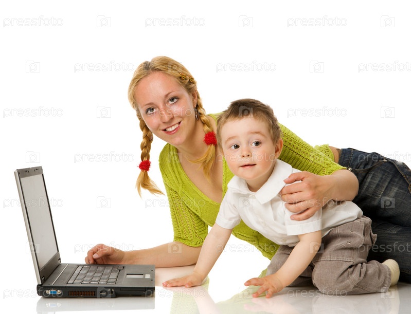 Мать и сын лежат на полу с ноутбуком на белом фоне