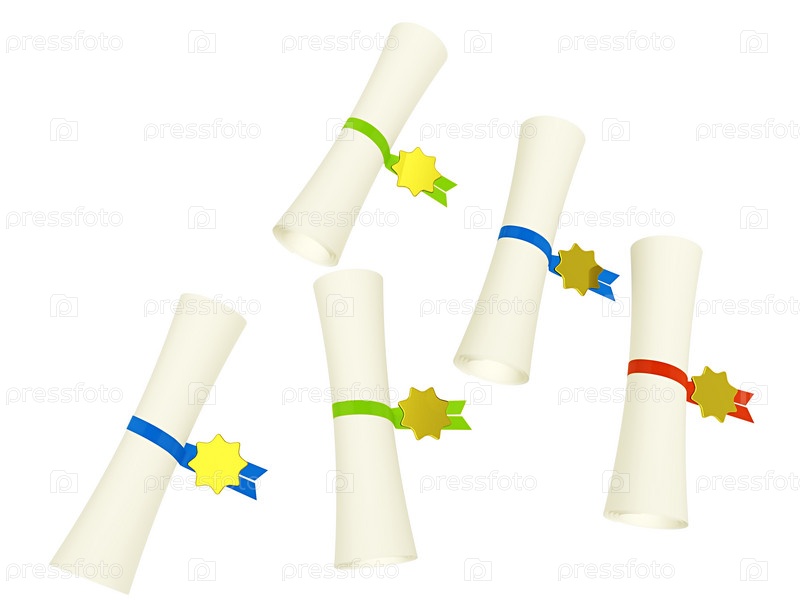Дипломы, сложенные трубочкой на белом фоне