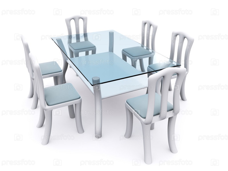 Стеклянный обеденный стол со стульями на белом фоне