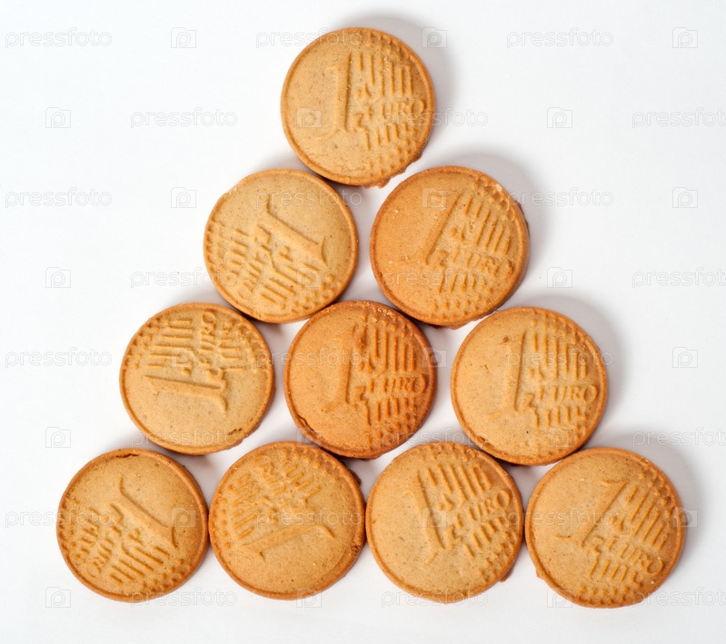 Печенье в форме монеты евро выложено треугольником