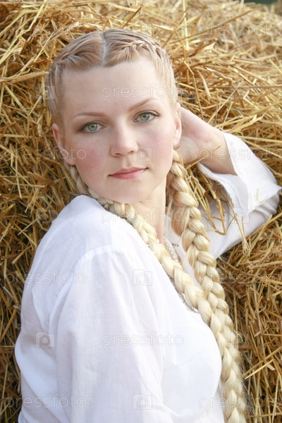 Девушка стоит возле стога сена