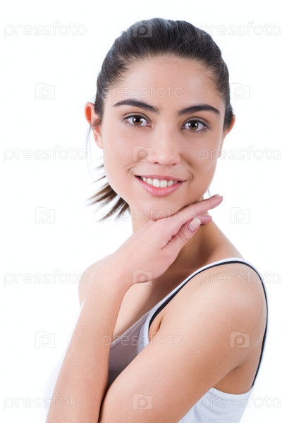 Свежая девушка смотрит на камеру с улыбкой, при этом касаясь ее подбородка