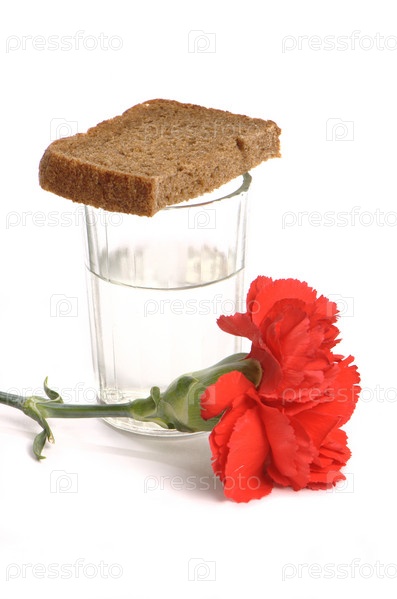 Стопка водки и красная гвоздика на белом фоне