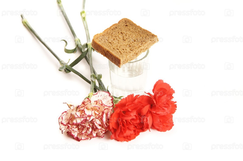 Стопка водки и красные гвоздики на белом фоне
